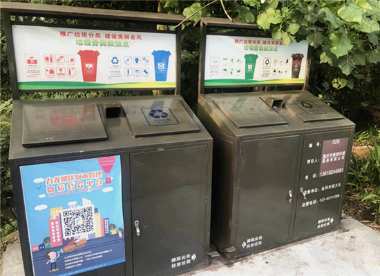 金鳳鎮(zhèn)自行設(shè)計、制作的腳踏式分類垃圾箱(初梓瑞 攝)