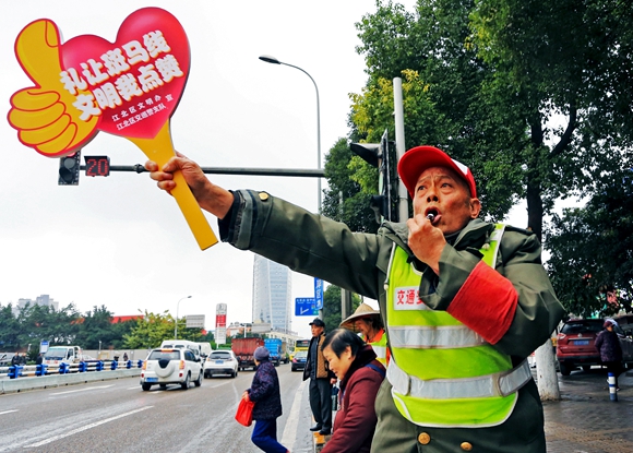 江北區寸灘街道蘭溪社區志愿者李仲賢在進行交通文明勸導。