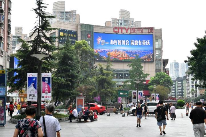 “智能化,為經濟賦能,為生活添彩”“行千里,致廣大”“爭做文明人,共建新城市”……在江北區觀音橋步行街,幾個LED屏高頻率播放著智博會公益廣告,向來往市民和游客介紹著這次盛事。