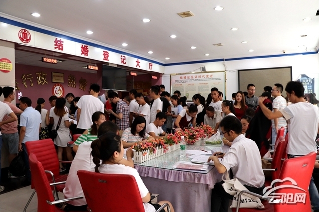 當天下午,記者來到縣民政局登記大廳,看見資料填寫臺、頒證窗口等地依然排著長隊。工作人員貼心地給每一對情侶發了號牌,以免混亂和不必要的等待。據工作人員介紹,當天來登記的人數是往常的三四倍,截至下午7點,共有160余對新人登記領取了結婚證。