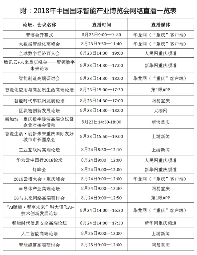 8月23日—25日智博會期間,還將陸續(xù)舉行數(shù)字經(jīng)濟(jì)百人會、智能生活·創(chuàng)新未來重慶國際友好城市市長圓桌會、新加坡-重慶數(shù)字經(jīng)濟(jì)研討會暨企業(yè)對接會、半導(dǎo)體產(chǎn)業(yè)、人工智能、智能制造、5G與未來網(wǎng)絡(luò)、工業(yè)互聯(lián)網(wǎng)、智能超算、智能化應(yīng)用與高品質(zhì)生活、智能時代信息安全高端等多場專業(yè)論壇活動,以及2018云棲大會·重慶峰會、釘峰會、騰訊云+未來重慶峰會、科大訊飛智慧城市創(chuàng)新行業(yè)應(yīng)用發(fā)展論壇、華為云中國行2018、智能時代車聯(lián)網(wǎng)發(fā)展論壇和區(qū)塊鏈創(chuàng)新發(fā)展論壇。對此,華龍網(wǎng)等媒體將分別進(jìn)行直播報道,請持續(xù)關(guān)注。