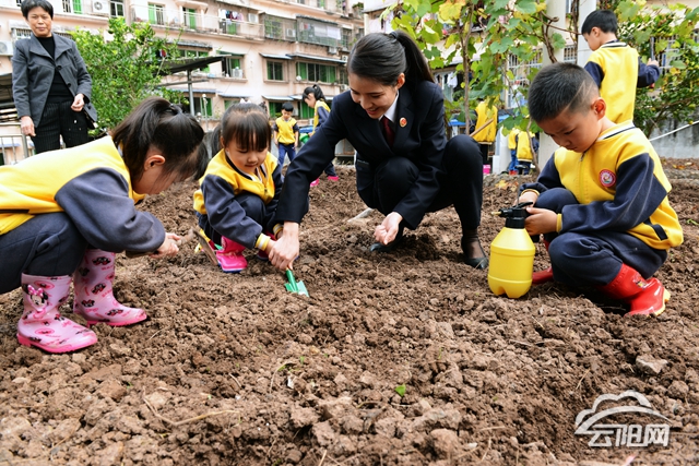 云陽網訊(通訊員 謝洪)10月18日,重慶市云陽縣實驗幼兒園,來自縣人民檢察院的“莎姐檢察官”同該幼兒園的孩子們攜手走進樓頂菜園地,通過栽種大蒜、蘿卜、土豆、蔥花、青菜頭等蔬菜種子,共同在秋天里播下金色的希望,收獲童年時代的夢想家園。