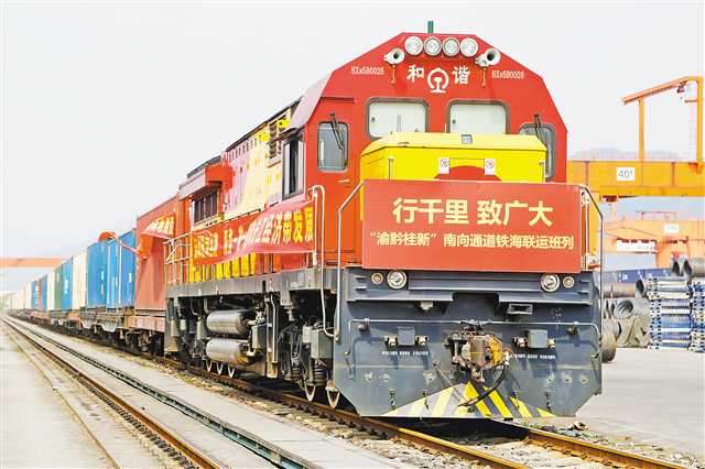 2017年9月25日,“渝黔桂新”鐵海聯運班列常態化運行首趟班列在重慶鐵路口岸首發。該線路從重慶鐵路口岸出發,通過鐵路至廣西欽州港,再海運至新加坡等東盟各港口,進而連通國際海運網絡。