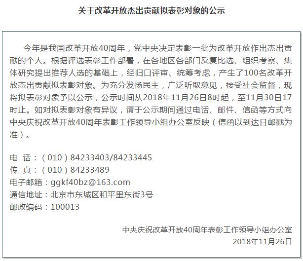 今年是我國改革開放40周年,黨中央決定表彰一批為改革開放作出杰出貢獻的個人。根據評選表彰工作部署,在各地區各部門反復比選、組織考察、集體研究提出推薦人選的基礎上,經歸口評審、統籌考慮,產生了100名改革開放杰出貢獻擬表彰對象。為充分發揚民主,廣泛聽取意見,接受社會監督,現將擬表彰對象予以公示,公示時間從2018年11月26日8時起,至11月30日17時止。如對擬表彰對象有異議,請于公示期間通過電話、郵件、信函等方式向中央慶祝改革開放40周年表彰工作領導小組辦公室反映(信函以到達日郵戳為準)。
