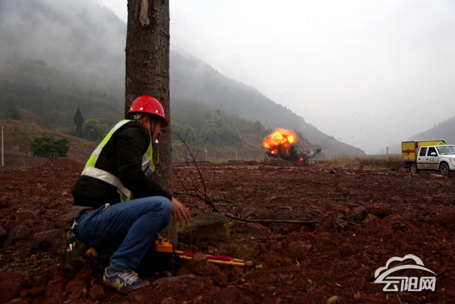 在挖掘機挖出的深坑中,防爆員分批在6000發雷管及3枚手榴彈上安插引線后,各路人員迅速撤離到安全地帶。防爆員按下了起爆器上的按鈕,爆破現場隨即傳來轟隆一聲巨響,上空頓時騰起了一片蘑菇云。