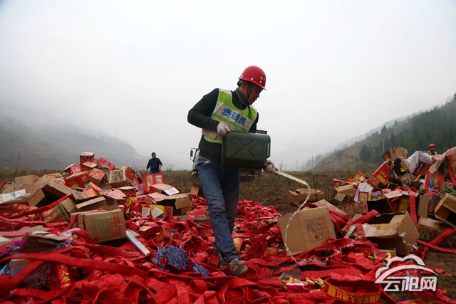 在另一處,準備在這里銷毀大量收繳上交來的煙花爆竹,隨著一陣“噼噼啪啪”的巨響,一簇簇彩色煙霧彌漫上空以及巨大火光“蘑菇云”的騰空而起,500多件非法煙花爆竹被付之一炬。
