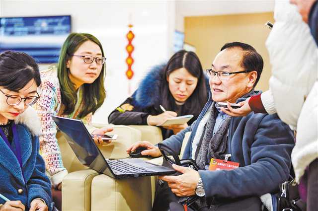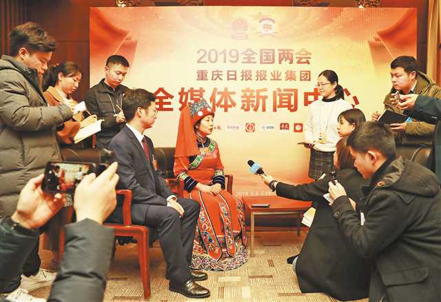 3月2日,重慶日報報業(yè)集團的全媒體記者正在采訪全國人大代表。當(dāng)日,重報集團兩會報道北京全媒體新聞中心投入運行。記者 巨建兵 攝