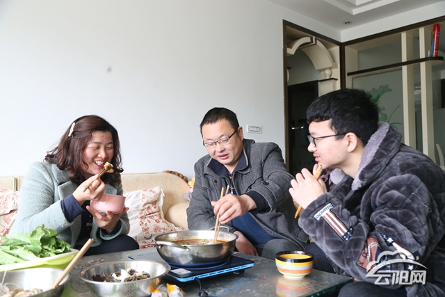 丈夫解開圍裙走出廚房,柳春香一家三口圍坐在電磁爐旁,兒子講著今天學(xué)校發(fā)生的趣事。一碗稀飯,一盆火鍋,笑聲陣陣。