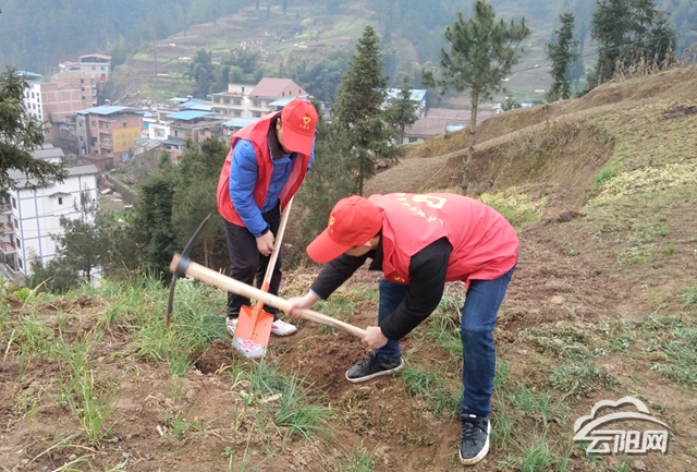 在植樹活動(dòng)現(xiàn)場(chǎng),青年志愿者們分工協(xié)作,互相配合,經(jīng)過2小時(shí)的勞作,荒坡空地上120余棵桃樹苗筆直挺立。