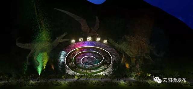 入口門區(qū)標(biāo)志景觀,呈現(xiàn)三段恐龍時(shí)期的進(jìn)化演變,以巖畫、綠植模紋與浮雕綜合藝術(shù)手法,表現(xiàn)各個(gè)時(shí)期獨(dú)特場(chǎng)景。