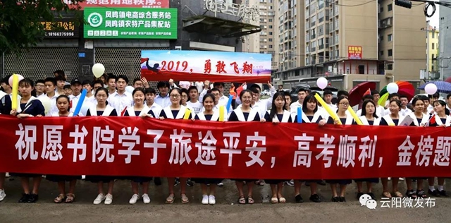 早上6點30分左右,交巡警紛紛到達了鳳鳴、紅獅等鄉鎮學校,此時,接送考生們的車隊已準備就緒。雖然天下著大雨,但學生們依然精神抖擻,在民警的指揮和引導下,井然有序地排隊出校門、上車。有不少考生家長前來送行,給孩子一個加油的擁抱;還有不少高一、高二的學弟學妹們為即將步入考場的師哥師姐吶喊助威,一聲比一聲高的“高考,必勝”響徹在雨中。