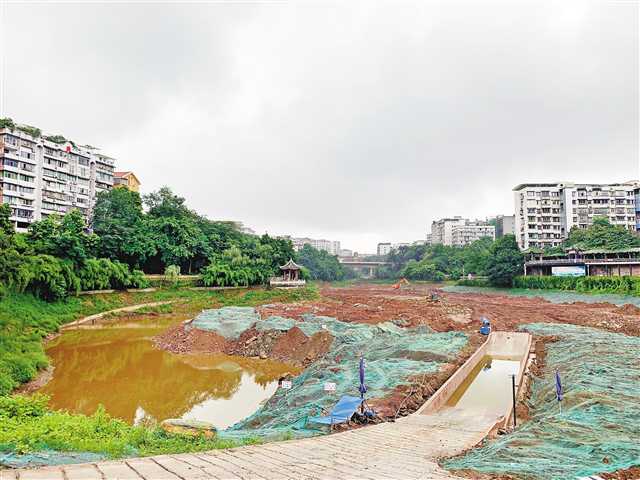 7月12日,細雨蒙蒙,渝北區(qū)雙龍湖公園里,幾臺機器正在緊張施工。放眼望去,湖內(nèi)大半面積已被渣土覆蓋。