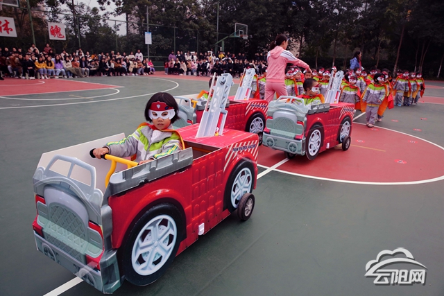 在入場(chǎng)式上,小一班的幼兒扮演著小小消防員毛毛,在3臺(tái)消防車的帶領(lǐng)下,排著整齊的隊(duì)伍,邁著矯健的步伐,進(jìn)入運(yùn)動(dòng)場(chǎng),高喊“我,火力全開(kāi)!”小二班扮演著汪汪隊(duì)中灰灰,他們披著綠色的披風(fēng),代表著綠色和環(huán)保,他們的特點(diǎn)是擅長(zhǎng)維修和回收,高呼“別丟掉,再利用!”在綠色環(huán)保車的帶領(lǐng)下走過(guò)主席臺(tái);小三班、小四班分別扮演汪汪隊(duì)中阿奇和小礫,經(jīng)過(guò)主席臺(tái),接受檢閱。在運(yùn)動(dòng)會(huì)上,他們都成為一道道靚麗的風(fēng)景……