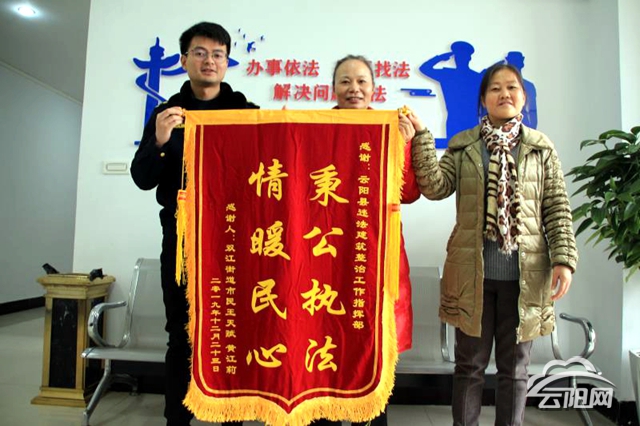 云陽網(wǎng)訊(記者 王彬彬)12月25日,家住雙江街道的黃女士把一面寫著“秉公執(zhí)法 ,情暖民心”的錦旗送到了縣違法建筑整治工作指揮部辦公室,真誠地表達(dá)對(duì)縣城市管理綜合行政執(zhí)法支隊(duì)拆違隊(duì)員的感謝之情。