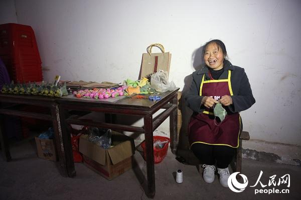 在陳朋揮灑汗水的同時(shí),譚明蘭也沒(méi)有閑著。今年7月,重慶市婦聯(lián)在華溪村設(shè)立巾幗扶貧車間家庭工坊,家庭工坊結(jié)合當(dāng)?shù)赝良绎L(fēng)俗文化元素,設(shè)計(jì)出布老虎、手提袋等特色產(chǎn)品,經(jīng)過(guò)一個(gè)月的培訓(xùn),譚明蘭掌握了制作手藝,如今每個(gè)月能收入1000元左右。不僅如此,譚明蘭還參與了村內(nèi)的公益性崗位,每年可收入4800元。
