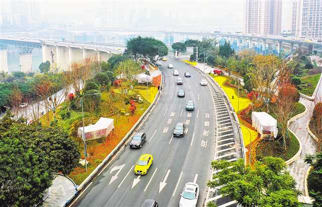 江北區建新南路,嘉陵江大橋北橋頭公園扮靚了城市街道。記者 崔力 攝
