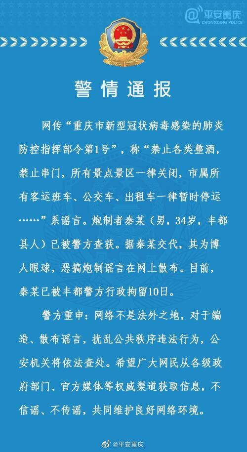 華龍網-新重慶客戶端1月26日11時03分訊(首席記者 佘振芳)今(26)日,重慶警方發布警情通報,網傳“重慶市新型冠狀病毒感染的肺炎防控指揮部令第1號”,稱“禁止各類整酒,禁止串門,所有景點景區一律關閉,市屬所有客運班車、公交車、出租車一律暫時停運……”系謠言。炮制者秦某(男,34歲,豐都縣人)已被警方查獲。