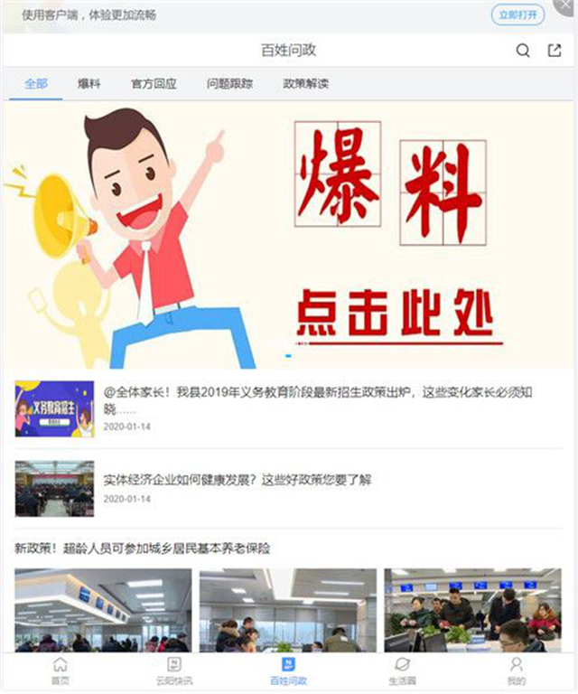 2、打開云陽手機(jī)臺,點(diǎn)擊首頁下方“百姓問政”,再點(diǎn)曝料,拍攝或填寫上傳即可。