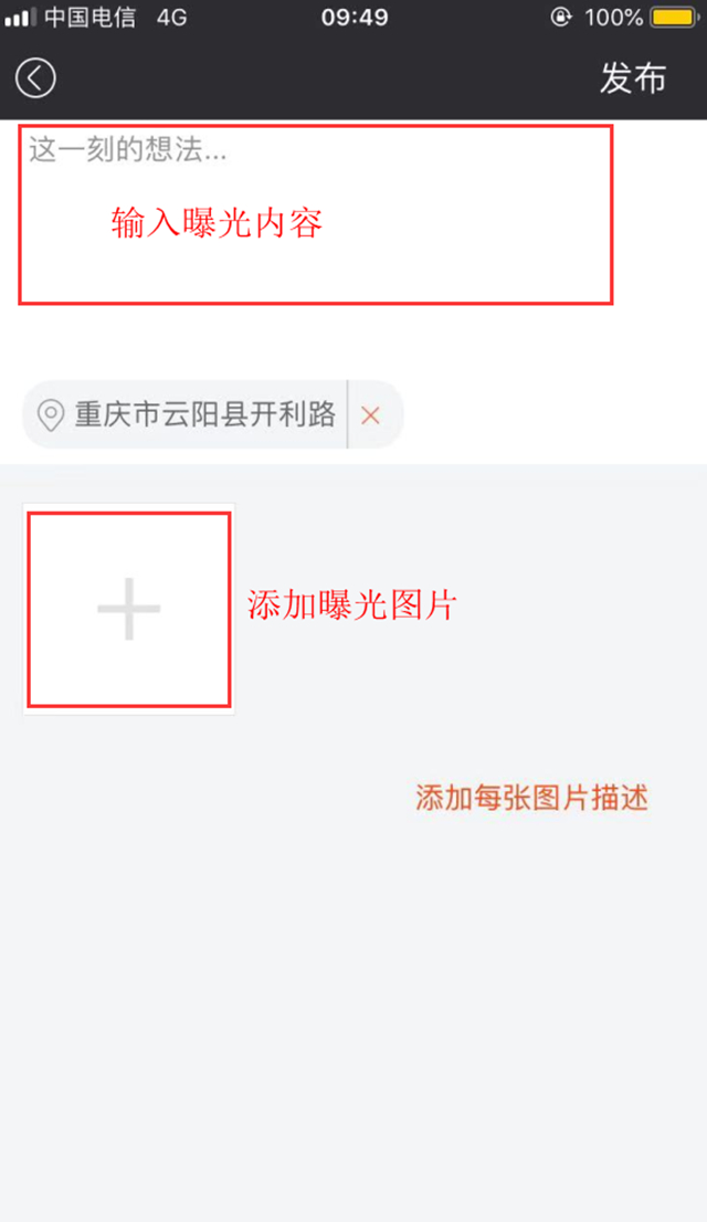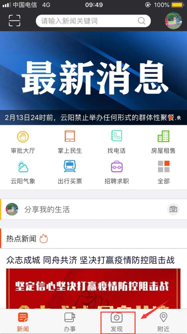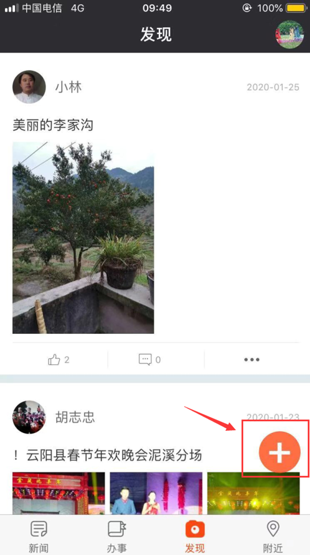1、打開智慧云陽APP,點(diǎn)擊首頁下方“發(fā)現(xiàn)”,再點(diǎn)擊頁面右下方的“+”,進(jìn)入拍攝或填寫上傳即可。