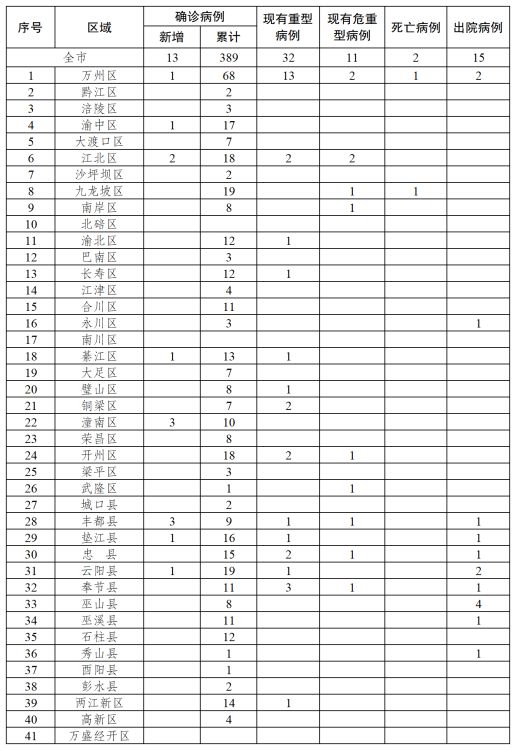 新增確診病例中,萬(wàn)州區(qū)1例、渝中區(qū)1例、江北區(qū)2例、綦江區(qū)1例、潼南區(qū)3例、豐都縣3例、墊江縣1例、云陽(yáng)縣1例;新增重型病例中,萬(wàn)州區(qū)7例、忠縣1例、兩江新區(qū)1例;重型病例轉(zhuǎn)普通型病例中,綦江區(qū)1例、兩江新區(qū)1例;重型病例轉(zhuǎn)危重型病例中,武隆區(qū)1例、奉節(jié)縣1例;危重型病例轉(zhuǎn)重型病例為銅梁區(qū)1例;新增出院病例為萬(wàn)州區(qū)1例。