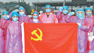 2月5日,在湖南益陽市高速公路鄧石橋出口,參與對乘車人進行體溫監測的康雅醫院黨員重溫入黨誓詞。為發揮黨員的模范帶頭作用,益陽各交通要道路口、車站卡口工作人員成立了臨時黨支部,設立了黨員示范崗。