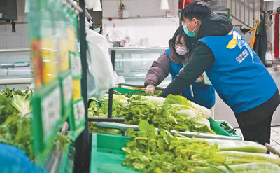 2月5日,在江蘇南京江寧區秣陵街道牛首社區一家超市,網格員陶慧(左)、王俊在幫助居家隔離的居民買菜。