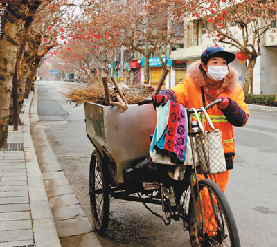 2月5日,湖北恩施市容環衛管理局的環衛工作者在清掃城市道路,維護環境衛生。