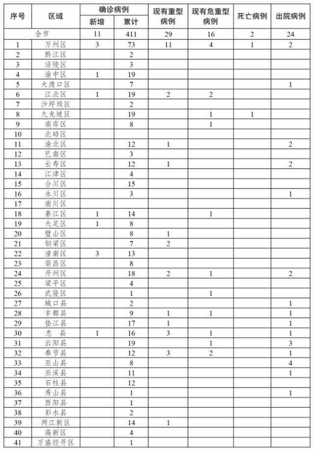 截至2月6日24時(shí),重慶市累計(jì)報(bào)告新型冠狀病毒感染的肺炎確診病例411例;現(xiàn)有重型病例29例,危重型病例16例,死亡病例2例,出院病例24例。累計(jì)追蹤到密切接觸者13066人,已解除醫(yī)學(xué)觀察5627人,尚有7439人正在接受醫(yī)學(xué)觀察。具體情況如下: