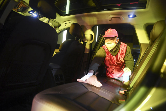 ↑2月6日晚,郭高平在云陽縣人民醫院等候下夜班的醫務人員時給車做清潔。新華社記者 王全超 攝