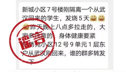 近日,有網友在微信群、朋友圈大量傳播消息稱:新城小區7號樓一武漢返家學生因新冠肺炎發燒5天被隔離,錦繡苑小區12號樓9單元也發現從武漢回來的住戶,請大家格外小心。