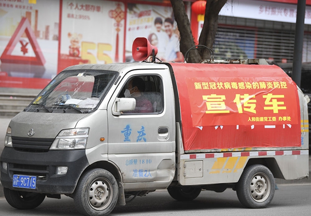 ↑2月4日,通過車載廣播進行疫情防控宣傳的車輛經過重慶市云陽縣人和街道。 新華社記者王全超攝