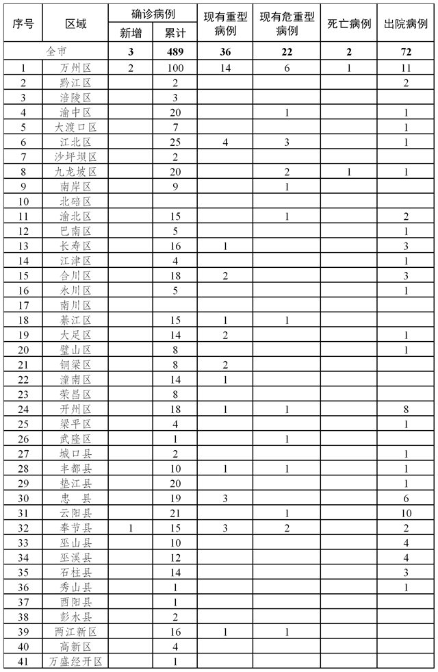 新增確診病例中,萬州區2例、奉節縣1例;新增出院病例中,開州區2例、奉節縣1例、巫溪縣2例、石柱縣1例。