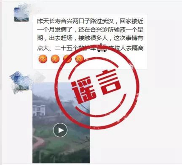 近日,網傳一則視頻信息,稱“開州區趙家街道開竹村村民辦酒席,酒席后出現大量新冠肺炎病例,當地專門出動特警押送至萬州”等。相關視頻在多個區縣的微信群持續傳播,且該謠言經改頭換面,在多地網上流傳,引發不少網民恐慌。