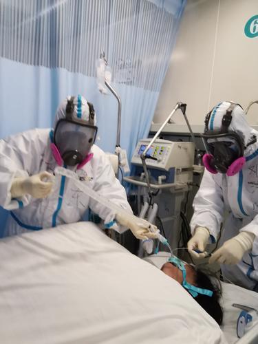 ▲2月26日,重慶赴孝感支援隊(duì)云夢醫(yī)療分隊(duì)醫(yī)護(hù)人員與云夢縣人民醫(yī)院醫(yī)護(hù)人員一起,為患者進(jìn)行氣管插管手術(shù)。這也是云夢當(dāng)?shù)剡M(jìn)行的首例氣管插管手術(shù)。 受訪者供圖