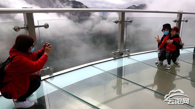 “似漫步云端天際之間,步步驚心!霧中賞景,更是妙如仙境。”來到龍缸景區的云端廊橋,早上的濃霧還未散去,大家更是興奮不已,紛紛踏上橋面感受龍缸的險峻。膽大的還坐上了懸崖秋千,在空中欣賞山林幽秀景色,驚險又刺激。