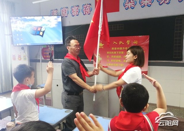 接著,輔導(dǎo)員為新隊(duì)員佩戴紅領(lǐng)巾并帶領(lǐng)新隊(duì)員莊嚴(yán)宣誓:“為共產(chǎn)主義事業(yè)而奮斗!時刻準(zhǔn)備著!”