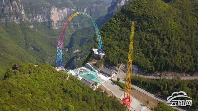 懸崖大秋千位于龍缸景區海拔1100多米的猴子埡口,建在距離石筍河河面將近700米高的懸崖邊緣。
