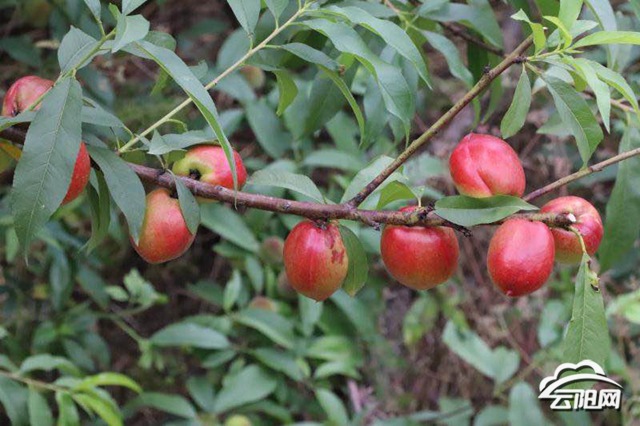 去年4月,這里千畝桃花競(jìng)相綻放,美不勝收。如今,桃花已變成了鮮果,而成熟期最早的紅珍珠油桃早已按捺不住,爬上樹梢,將樹枝壓彎了腰。