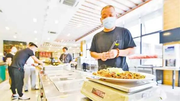 與北區(qū)食堂不同,南區(qū)食堂采取了“稱重收費(fèi)”的方式杜絕浪費(fèi)。前來就餐的員工排隊(duì)自助取餐,隨后統(tǒng)一到窗口處稱重,根據(jù)餐食重量付費(fèi)。