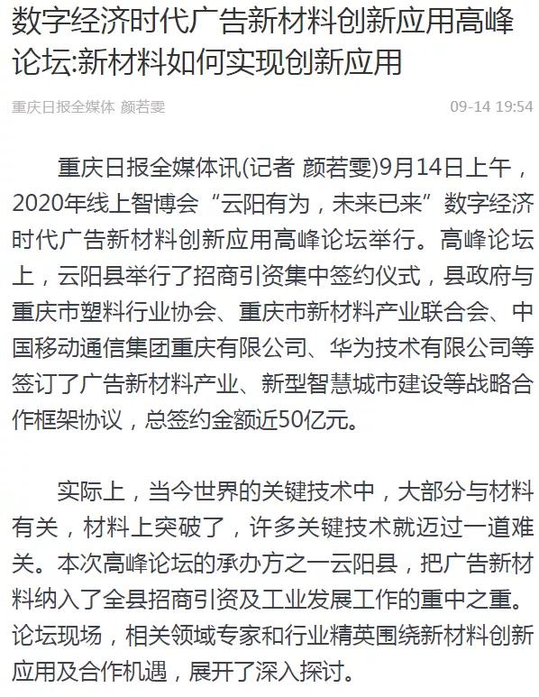 《聚焦2020線上智博會》——“云陽有為,未來已來”數字經濟時代廣告新材料創新應用高峰論壇舉行