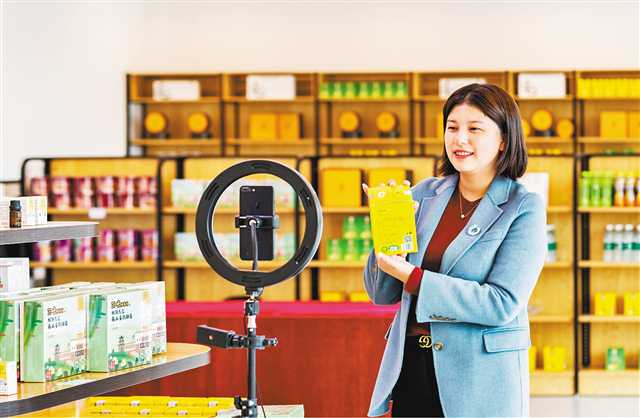楊雪梅為菊花產品直播帶貨。(萬靈鎮供圖)