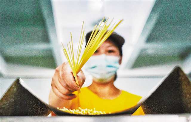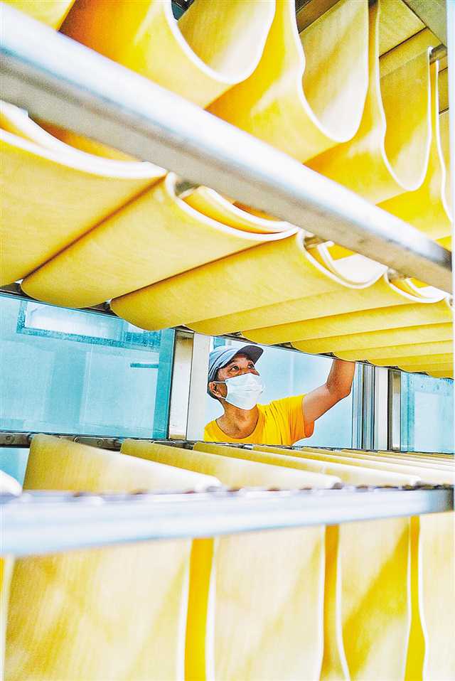 6月9日,云陽縣人和工業園區,陳大毛面業生產車間,陳莉正在面條烘房的運輸線上抽檢。記者 崔力 攝/視覺重慶