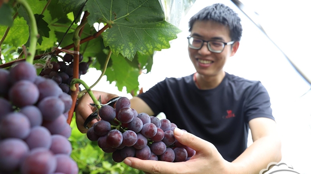 八月盛夏,葡萄飄香。鳳鳴鎮馬軒村多集合生態農業發展有限公司的葡萄園里,“陽光玫瑰”葡萄迎來豐收季,累累碩果掛滿藤蔓,吸引眾多游客前來體驗采摘樂趣。