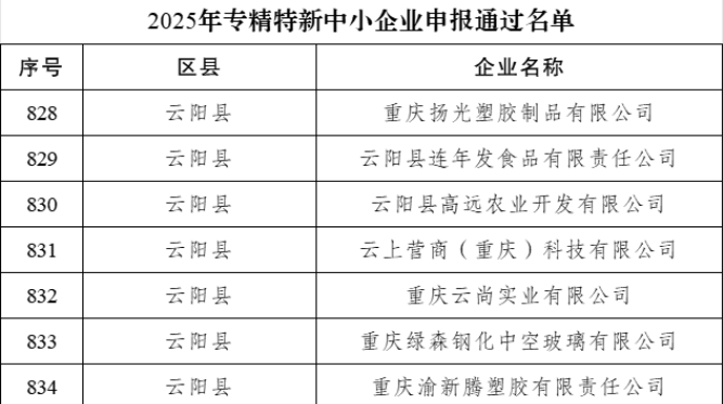 近日重慶市經濟和信息化委員會公布2025年重慶市專精特新中小企業申報和復核通過名單云陽縣新增14家市級專精特新中小企業復核通過5家企業